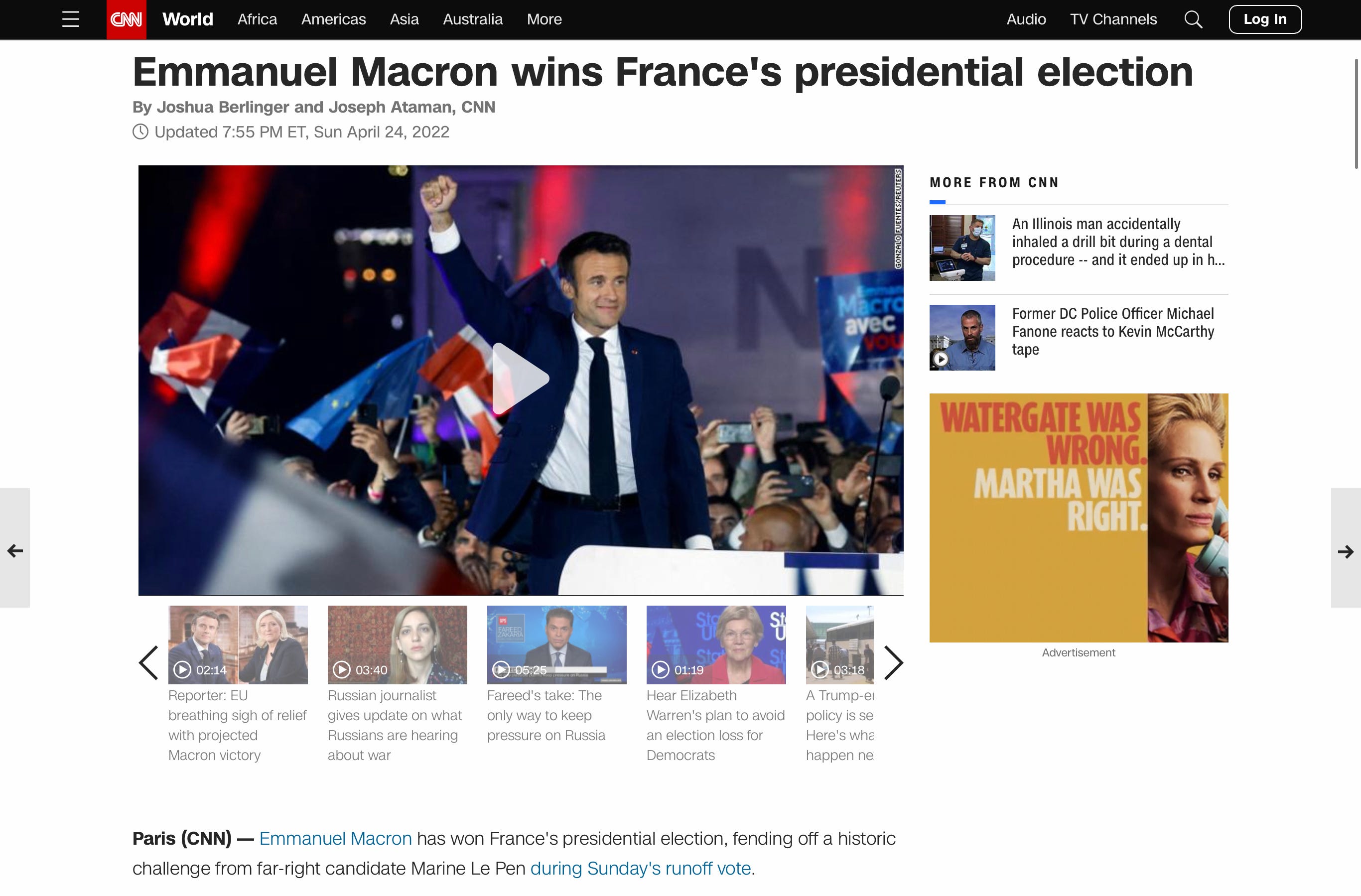 But: the last French President to be re-elected was Putin’s good friend Jacques Chirac 20 years ago. Macron didn’t really campaign (he’s really bad at it anyway), and yet he won… that’s good.