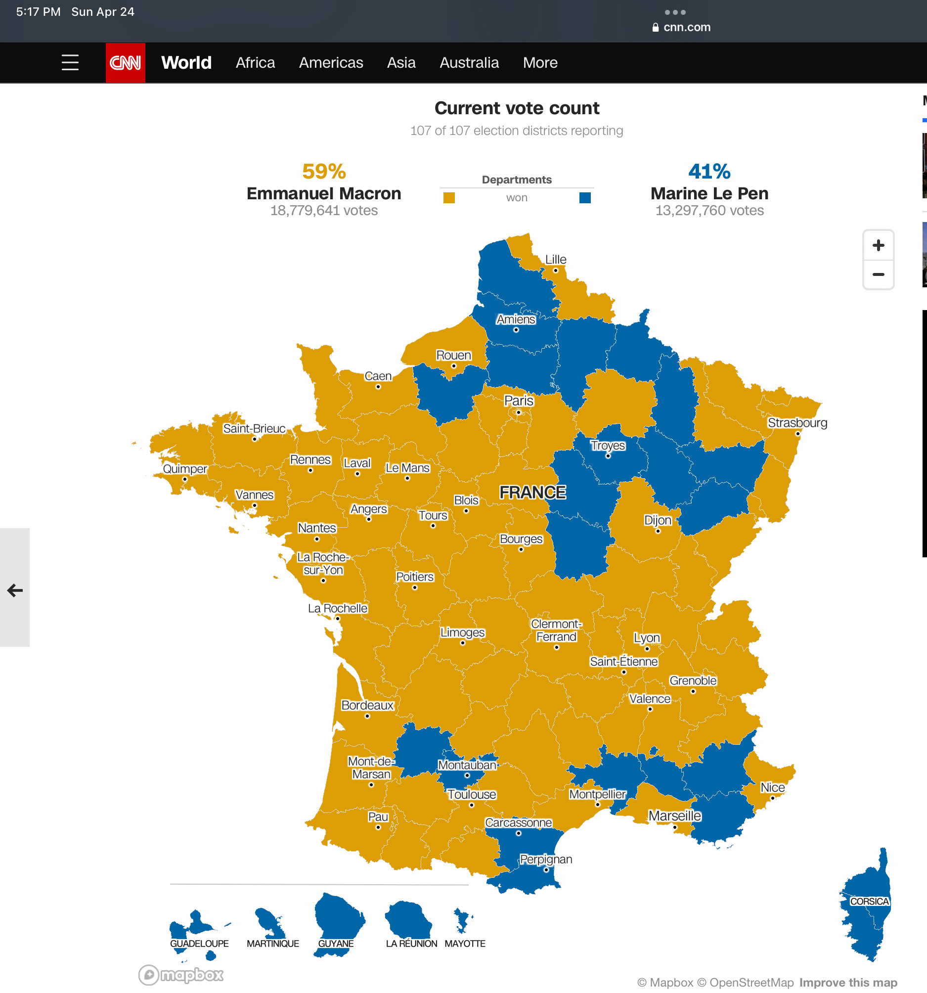 This appears to be a decisive victory for Macron, who, no matter what you think of him, is not far right Nazi-sympathizer Marine LePen.