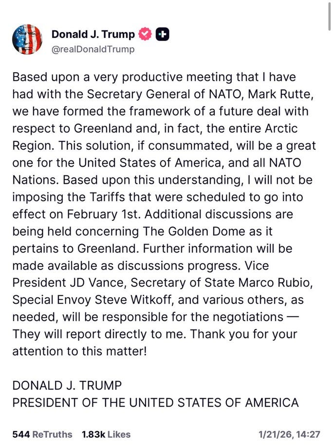 Just after Trump’s speech, NATO chief Mark Rutte—who has been playing the role of Trump Whisperer for the EU since the election—apparently told Trump that if the U.S. put tariffs on Europe over Greenland, the EU’s retaliation would cause an American financial winter.