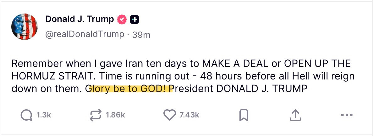 Trump’s latest threat Saturday morning includes the English translation of Subhanallah—“Glory be to Allah”—reframed through a Christianized lens. This is a deliberate effort to transform a military fiasco into an existential holy war—and mirrors Pete Hegseth’s racist Arabic “infidel” tattoo, which also inverts the meaning of an Islamic phrase.