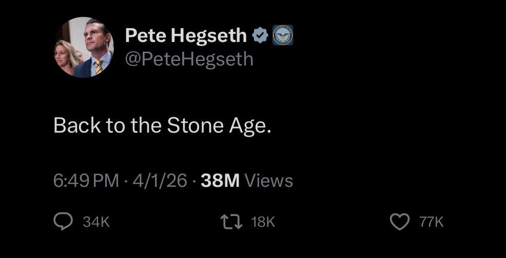 When Donald Trump said on Wednesday he would bomb Iran “back to the Stone Age”—a threat mirrored by his “War Secretary”—he was openly vowing to use his technological capacity to erase civilization from a country of ninety million. The Stone Age, defined loosely as the era humans needed to use stone tools, may sound primitive and alien to civilized people, but it accounts for 99% of homo sapiens’ 300,000 year existence.