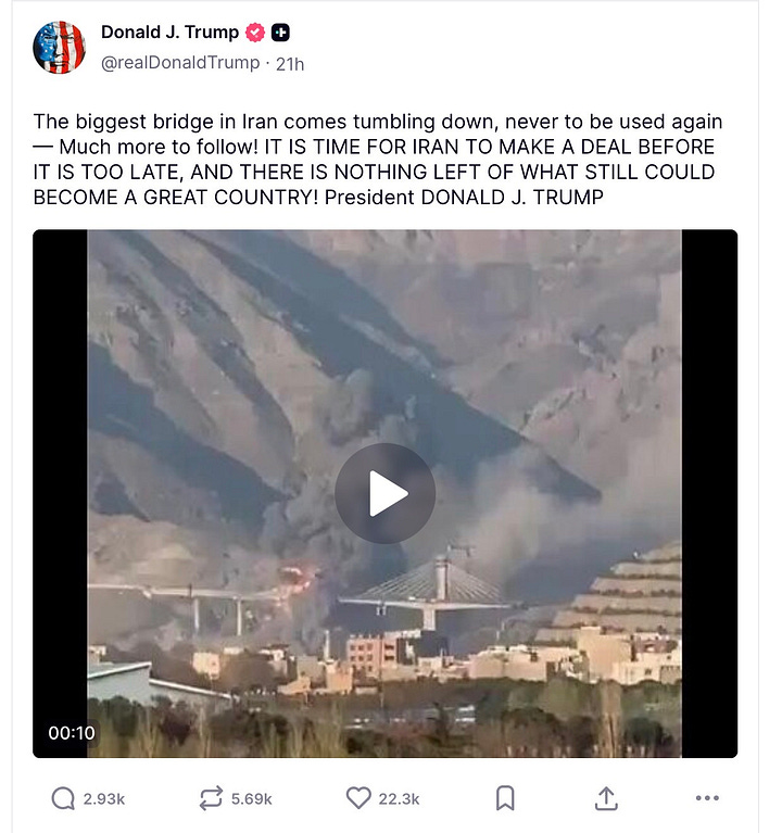 The threat was not idle. Trump and Hegseth followed through by destroying the tallest bridge in Iran—not a military target—in a double-tap strike that killed rescuers.