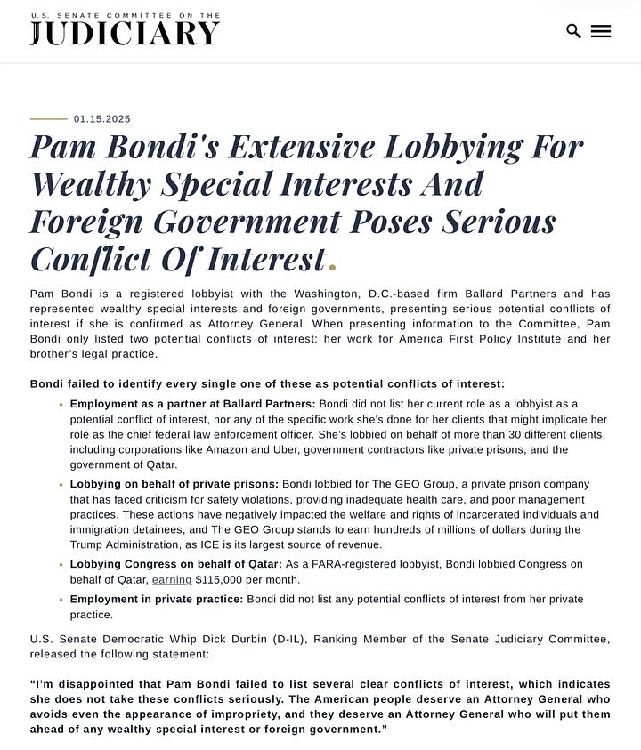 Second, Bondi’s lobbying work is precisely aligned with the Trump regime. She was a lobbyist for private prison contractor GEO Group, whose main customer is ICE. And she was paid $115,000 per month to lobby Congress on behalf of Qatar.