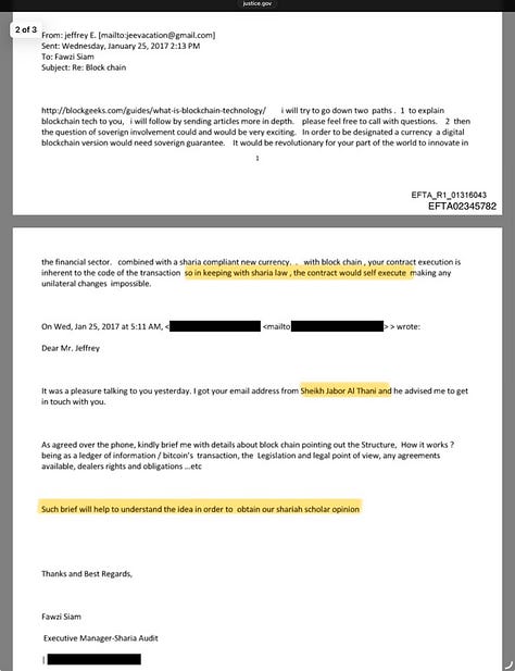 As a Florida resident in 2017, Jeffrey Epstein received this note from a Qatari banker in charge of ensuring Bitcoin transactions were compliant with sharia law.