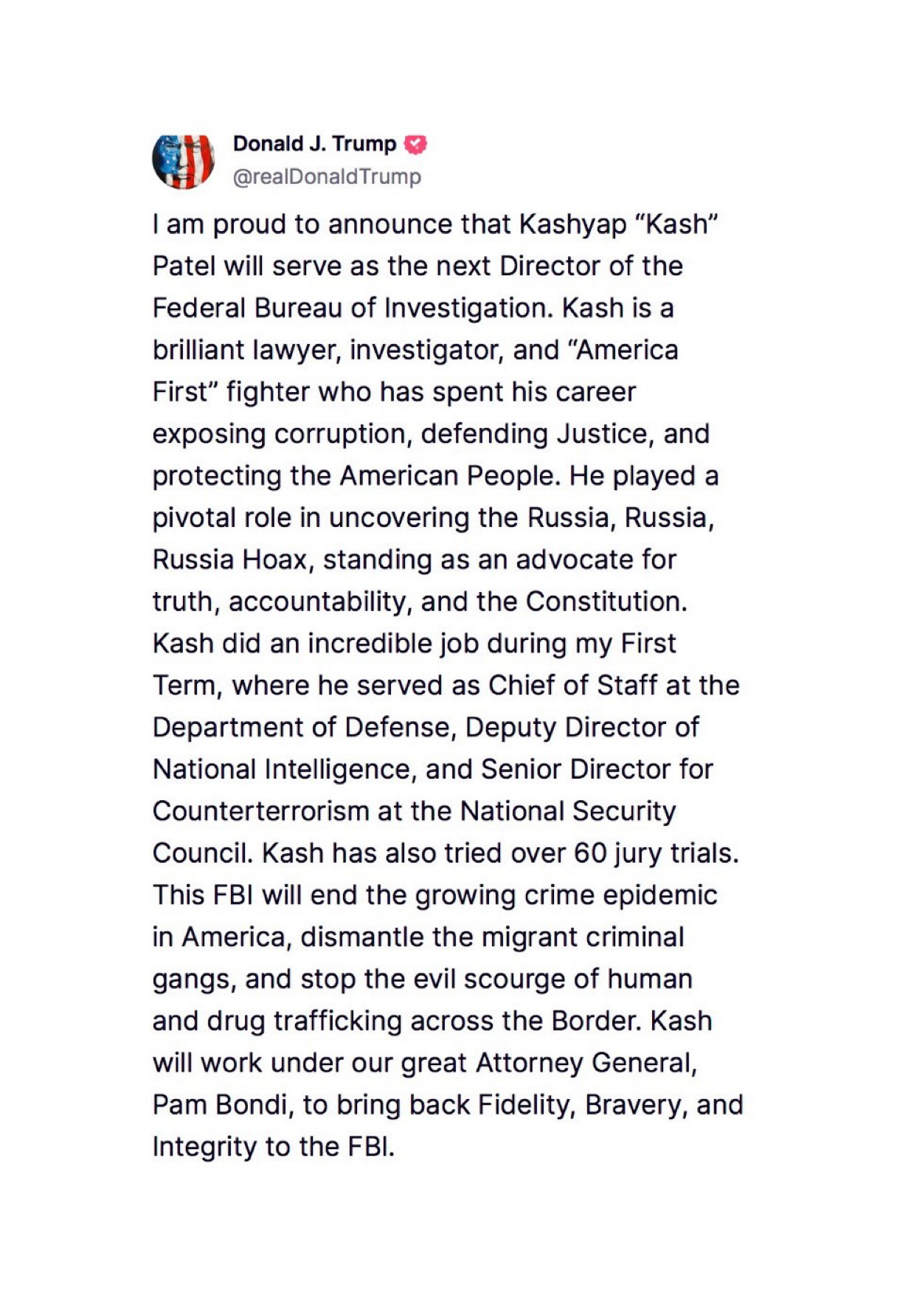 Patel must be confirmed to assume this Director of the FBI role. He must be stopped by Congress and not confirmed. This would be an appropriate moment in time to have robust protests outside Congress for this authoritarian candidate amongst others waiting on confirmation. We can also flood our MOC's with phone calls and bombard them. They must stop Trump's candidates. No recess observed!