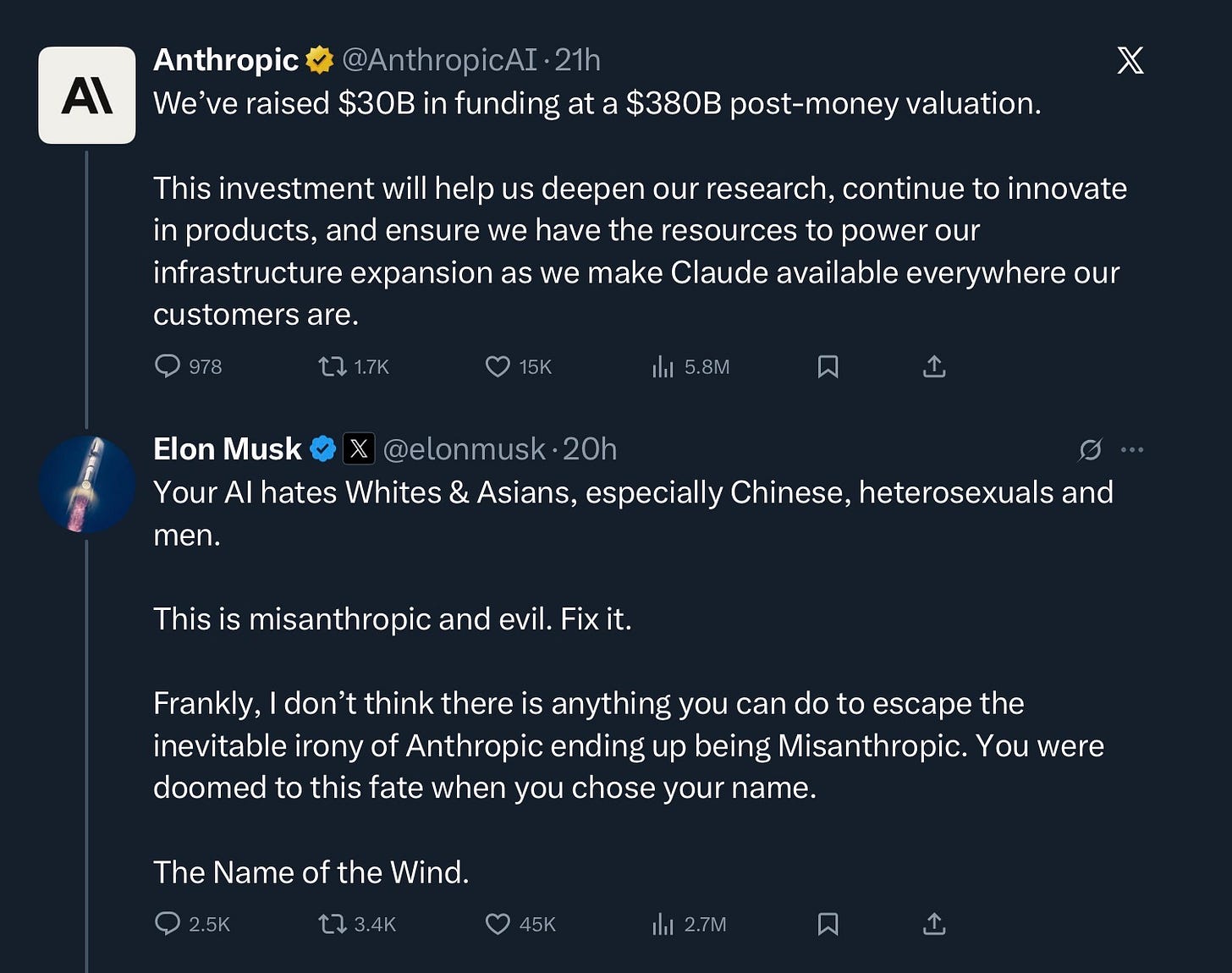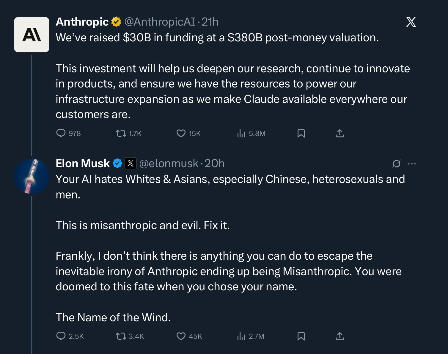 He frames his competition as a combatant in an information race war against “Whites & Asians, especially Chinese”—an allowance used to deflect his pathological white supremacy—to both smear Anthropic, and try to divide and conquer their audience through sheer racism.