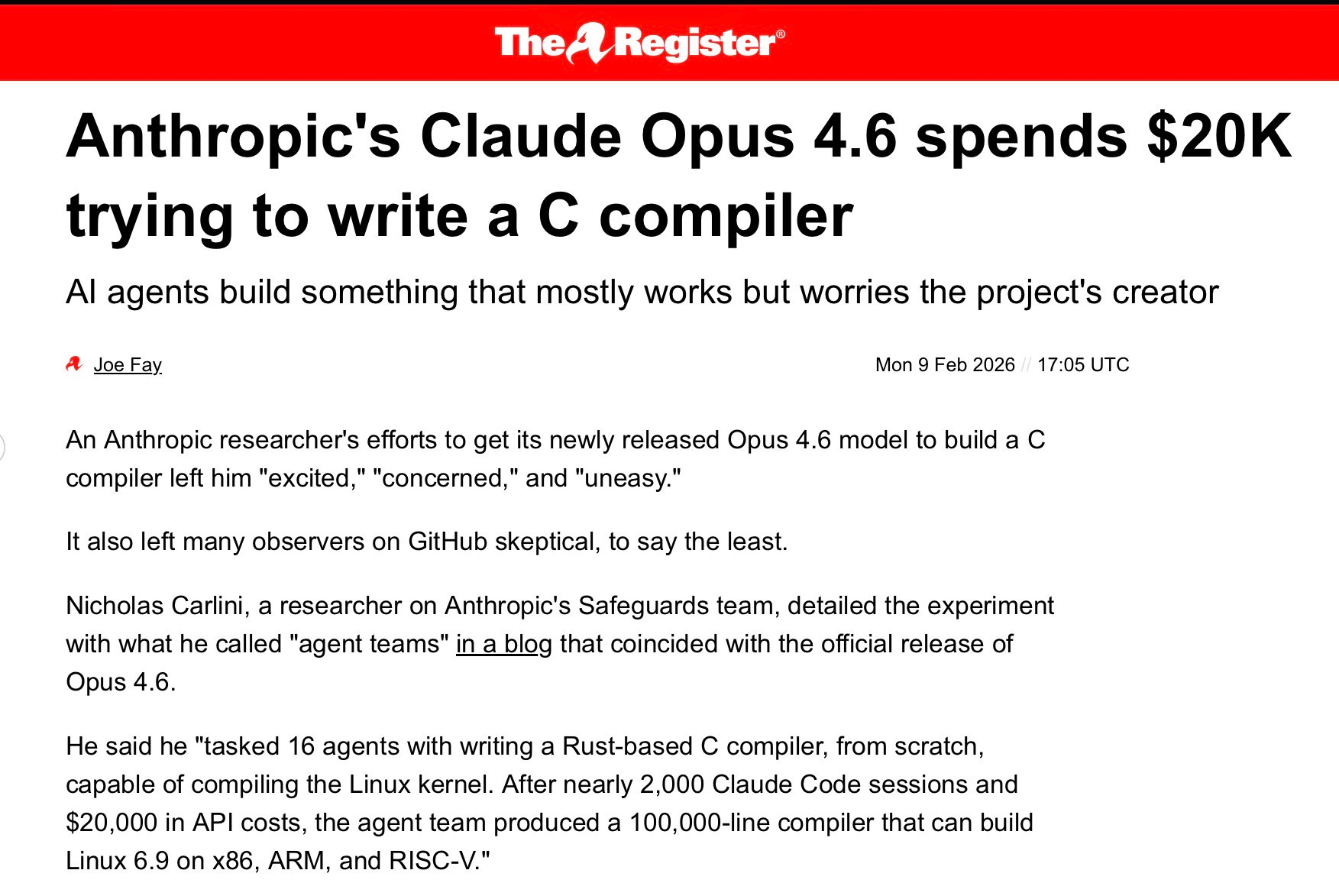 As another example of chatbot hype gone wild, Anthropic, which is scheduled to go public this year at a valuation of more than $380 billion, made a huge deal out of an experiment where it tried to build one of the most documented pieces of software in the world, a C-compiler. They used 16 chatbots running for two weeks, at a cost of $20,000 in energy alone, and got a rickety pile of junk that kind of works, sometimes.