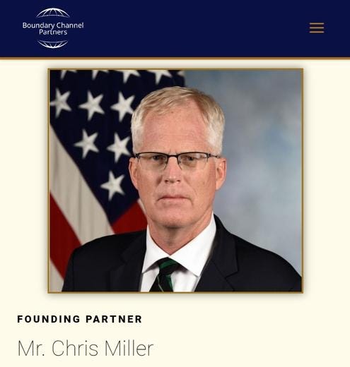 Chris Miller appears to have downsized Boundary Channel Partners which is now only himself and another seditionist who was installed at the Pentagon with Miller, former Undersecretary of Defense for Policy, white nationalist extremist Anthony Tata.