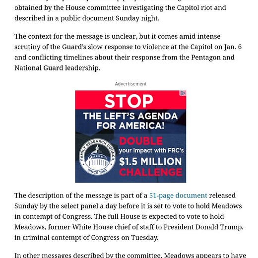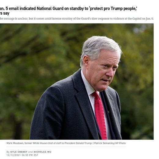 In the Hannity interview Patel and Miller disclose that they had a meeting on January 4th with Trump and Gen. Milley where Miller claims Trump authorized 20,000 National Guard troops. The problem with that is that he explicitly said it was to “protect pro Trump people.” As we now know, Trump wanted to lead those armed “pro Trump people” into the Capitol itself.