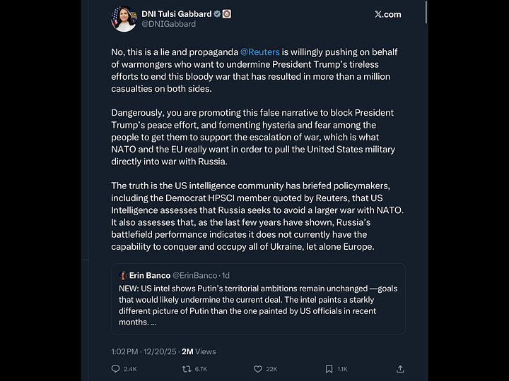 Director of National Intelligence Tulsi Gabbard, who has been a Russian asset for many years, is accusing the “Deep State” and NATO of misrepresenting Putin’s good intentions—even as Putin commits war crime after war crime.