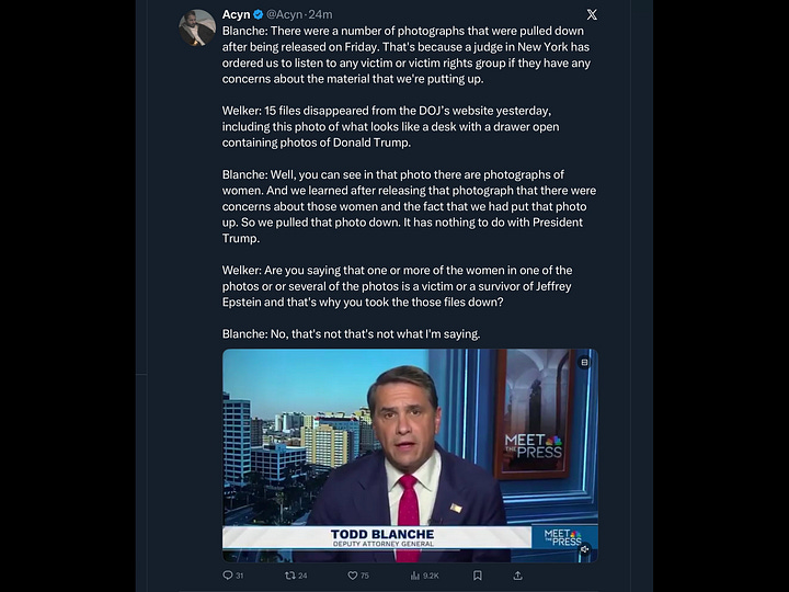 Trump’s personal defense lawyer Todd Blanche, who was installed as Deputy Attorney General with clear instructions to cover up for Trump’s Epstein connections, failed to meet the deadline for the release of the files, which was required by law.