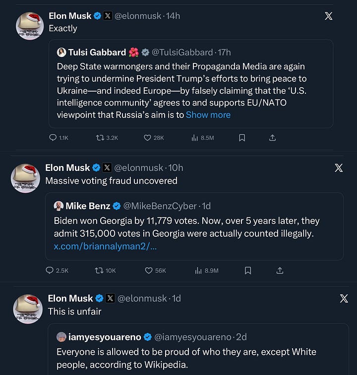 And Elon Musk seems to be in a panic to help Trump and Putin, and to spread his racist ideology, as he nears a trillion dollars in wealth.