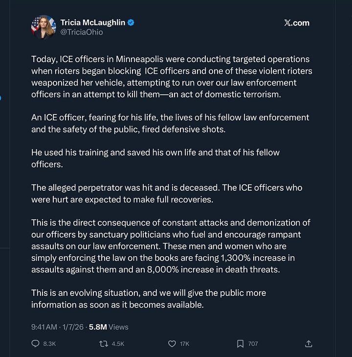 A 37-year-old legal observer of ICE was murdered in Minneapolis by a federal agent in her car Wednesday morning as she tried to leave the scene of a minor interaction. She was warning people that ICE was coming to their neighborhoods—a constitutionally protected right. Federal agents approached her car and illegally tried to enter the vehicle. When she tried to drive away, one of the agents shot her in the face.