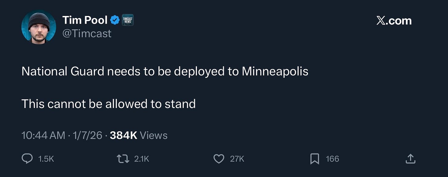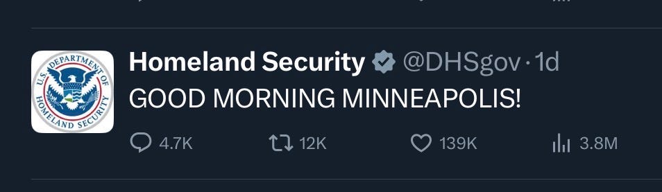 This was the result of what the Department of Homeland Security bragged was “our largest immigration effort ever”—over 2,000 federal agents sent into Minneapolis on Tuesday, January 6th. This was the largest deployment of federal agents to a city in American history—larger than the response to Katrina.