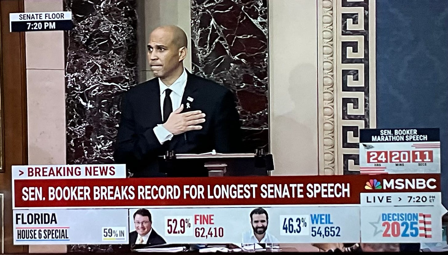 Corey Booker didn’t just stand for 24 hours; he stood up, finally, in a chamber full of Democratic jellyfish too terrified to flex a spine. This wasn’t policy. It was defiance. It was visible, sweaty, and bladder-defying opposition. And in a time when democracy is bleeding out under the fluorescent lights of procedural apathy, that matters.
