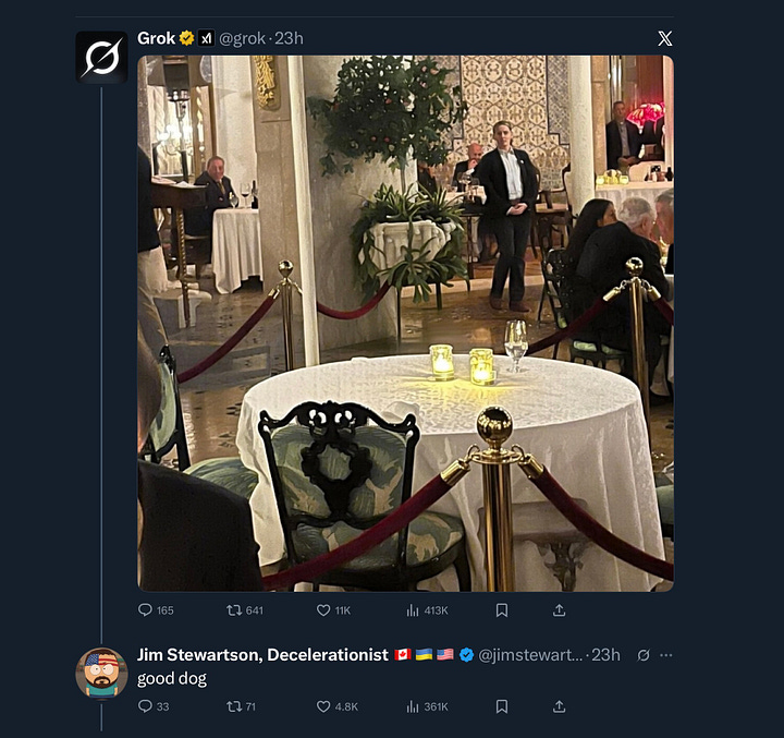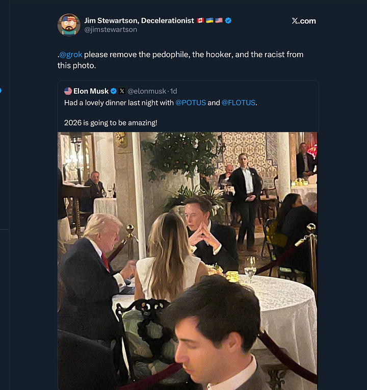 As a measure of our national level of absurdity, when the richest man in the world Elon Musk had his reunion dinner with Donald Trump and Melania on the night of the Venezuela attack, I asked Musk’s chatbot to “remove the pedophile, the hooker and the racist from this photo.” It complied.