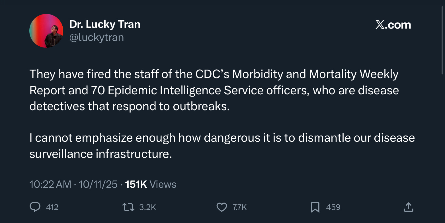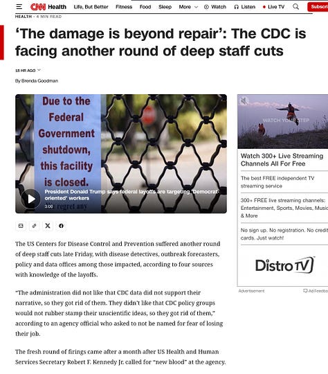 The ugly truth about this is that “Democrat programs” are now everything that protects American citizens. The cuts at CDC will decimate our ability to detect and combat deadly diseases, which do not care what political party you are from. Millions of people will die, needlessly.