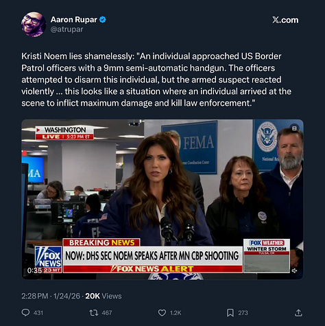 More disgraceful responses from Noem and Miller. They have no justification for this murder. Kristi Noem lied at her press conference. As Governor Walz said, "The federal government cannot be trusted to lead this investigation. The State of Minnesota will do it."