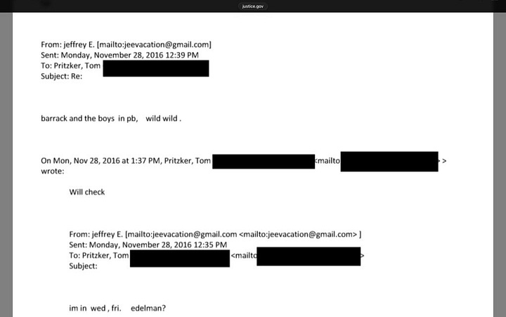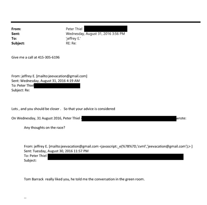 Barrack met with Epstein on a constant basis, including meetings with the Russian ambassador to the UN, Vitaly Churkin, throughout 2015 and 2016—and a “wild wild” week “with barrack and the boys in pb” (Palm Beach) a few weeks after the election. Barrack also met Epstein’s friend Peter Thiel in August 2016.