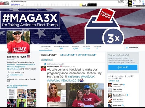 The “digital soldiers” Flynn was referring to included people like Jack Posobiec, Jared Wyand, and Mike Jr. who were organized in MAGA3X, a political action committee funded by Peter Thiel, and organized by the president of Thiel Capital, white nationalist memetic warfare specialist Jeff Giesea. Flynn and his son promoted MAGA3X, and Jared Wyand, all through the election. They were central to MAGA3X—and to the worst political crime in American history, the theft of an election.