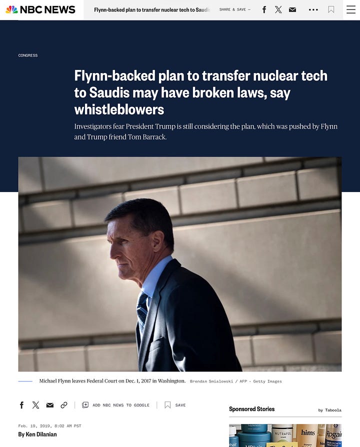 But Flynn had more at stake than just a job, he was planning a nuclear deal with Epstein’s good friend private equity investor Tom Barrack that would transfer America’s nuclear secrets to Saudi and Russia.