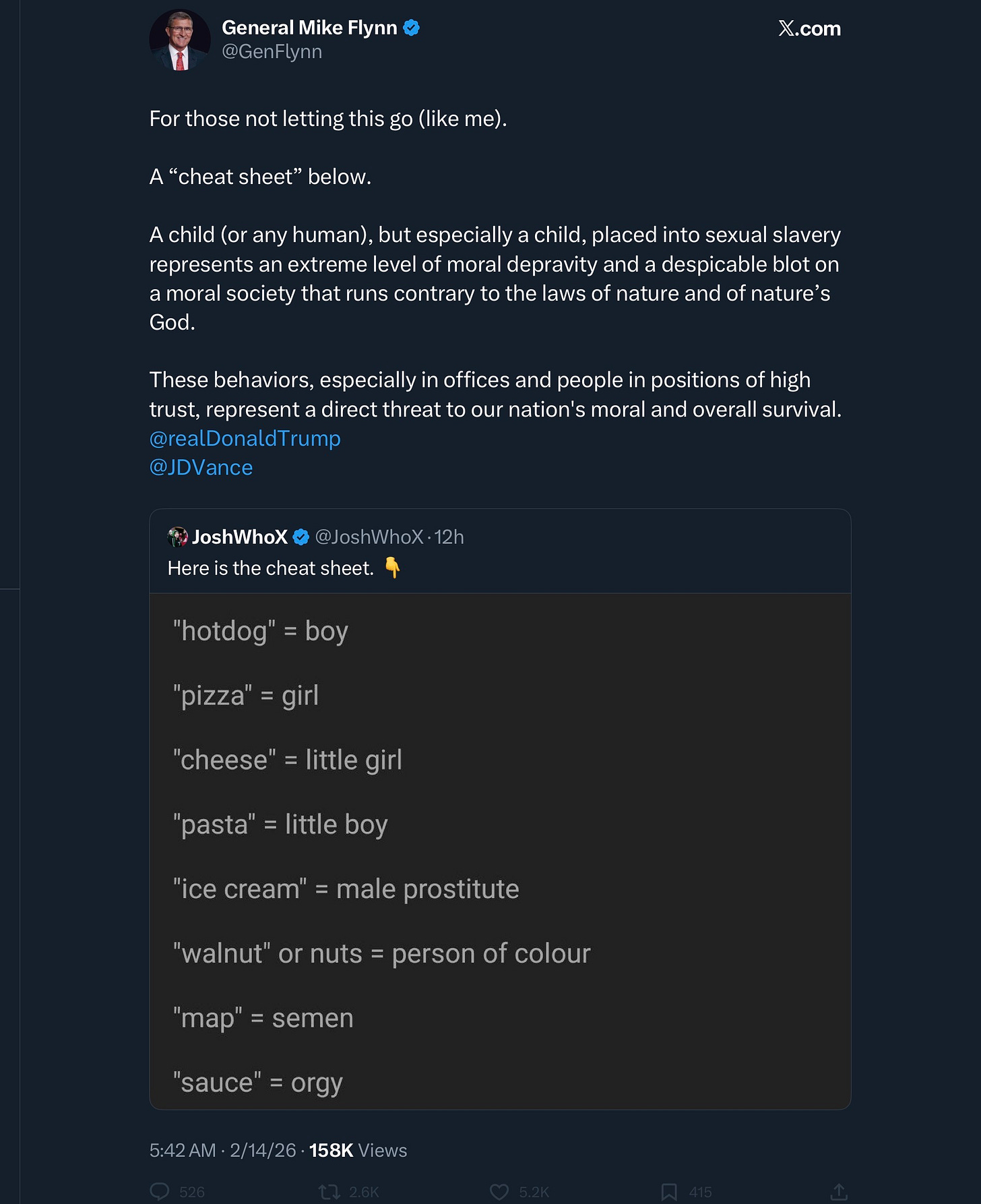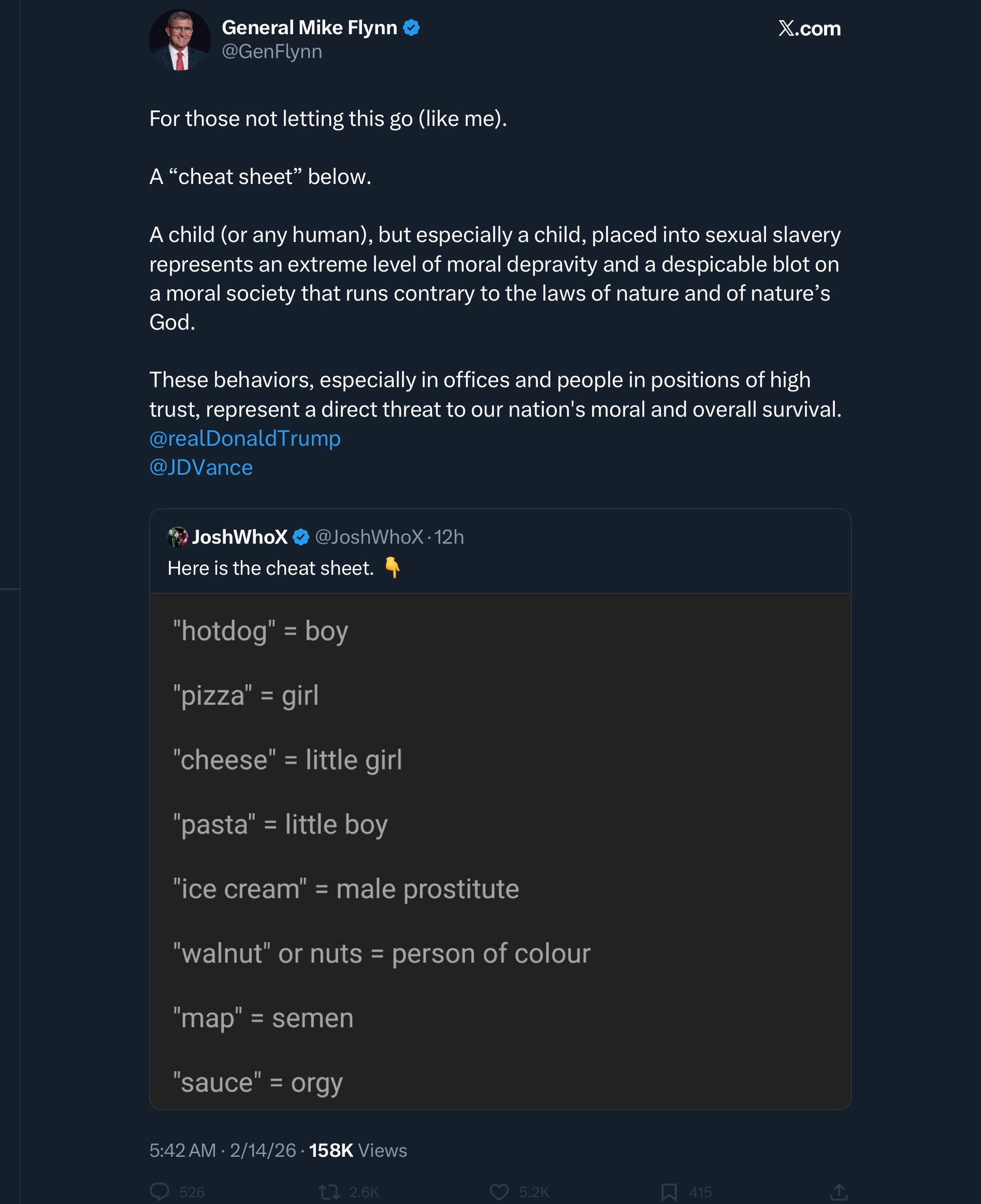 On Saturday, 2/15/26, nearly a decade later, Mike Flynn posted the exact same “cheat sheet” to his 2.1 million followers, signaling in the clearest possible terms that he wants them to investigate Epstein as part of Pizzagate fiction, instead of in objective reality. This is a deliberate effort to obfuscate the truth and divert attention from Flynn, his friends—like Steve Bannon—and Donald Trump.