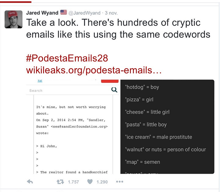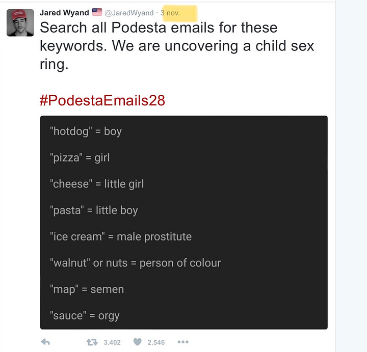 On 11/3/16, a virulently antisemitic groyper named Jared Wyand invented what came to be known as Pizzagate by tweeting a list of made up “keywords” with instructions to search for them in John Podesta’s emails which had been hacked by Russian military intelligence and released on Wikileaks on the same day as the Access Hollywood video.