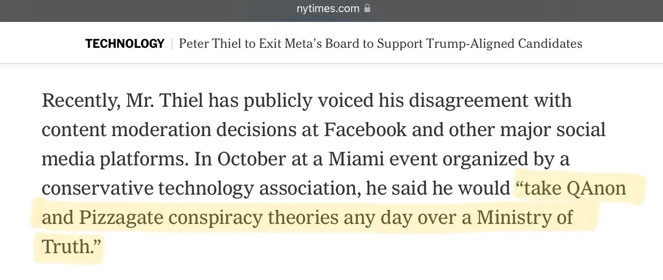 - He saw the internet as “alternate virtual reality” to escape to, which is why he funded and amplified alternate reality campaigns for Bitcoin (Satoshi), Trump (Pizzagate), Flynn (QAnon) and pushed Musk to buy Twitter and turn it into a psychological warfare platform. Thiel said this in 2022.