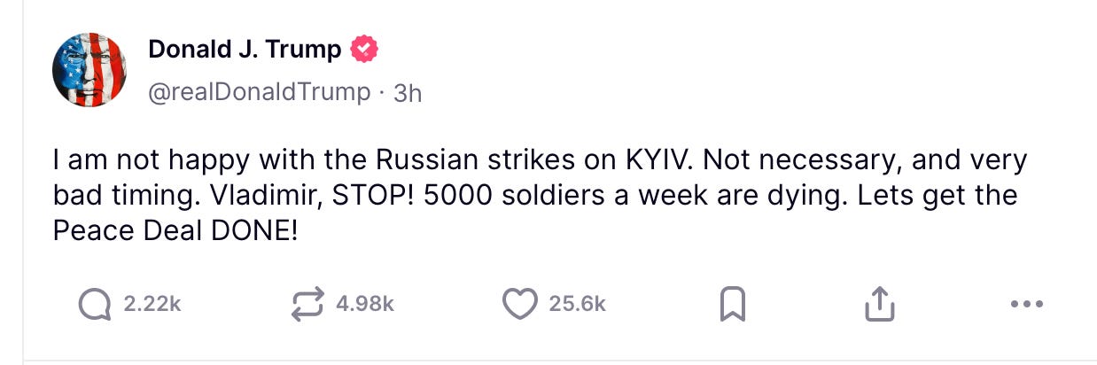 Trump’s reaction to Putin’s savage attack on a European capital that killed at least 8, including 2 children, and injured 77 more, does not even rise to a slap-on-the-wrist. Oh, Vladimir.