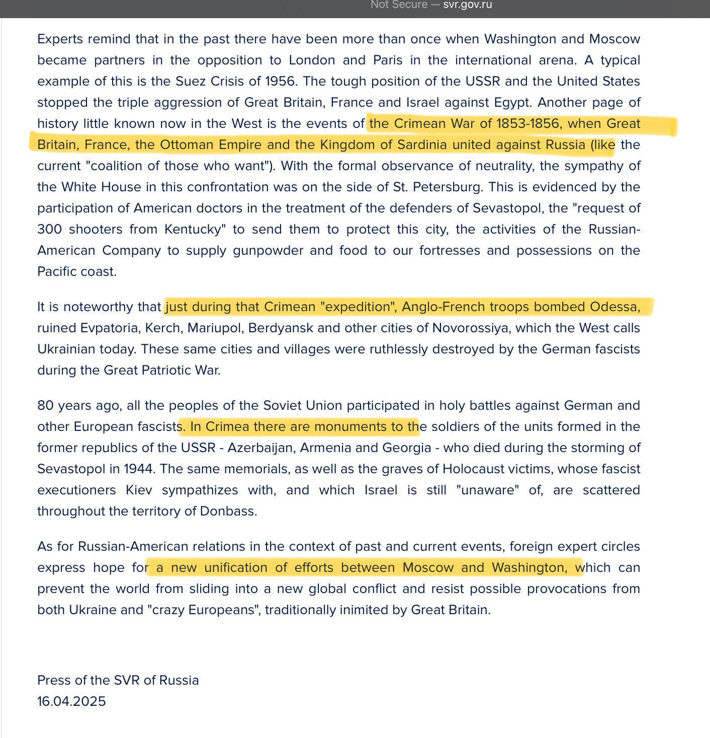 The SVR’s propaganda includes an alleged history of U.S.-Russian cooperation against the perils of European fascism, an ahistorical comedy of false narratives designed to promote a united front between the United States and Russia about allowing the permanent annexation of Crimea.