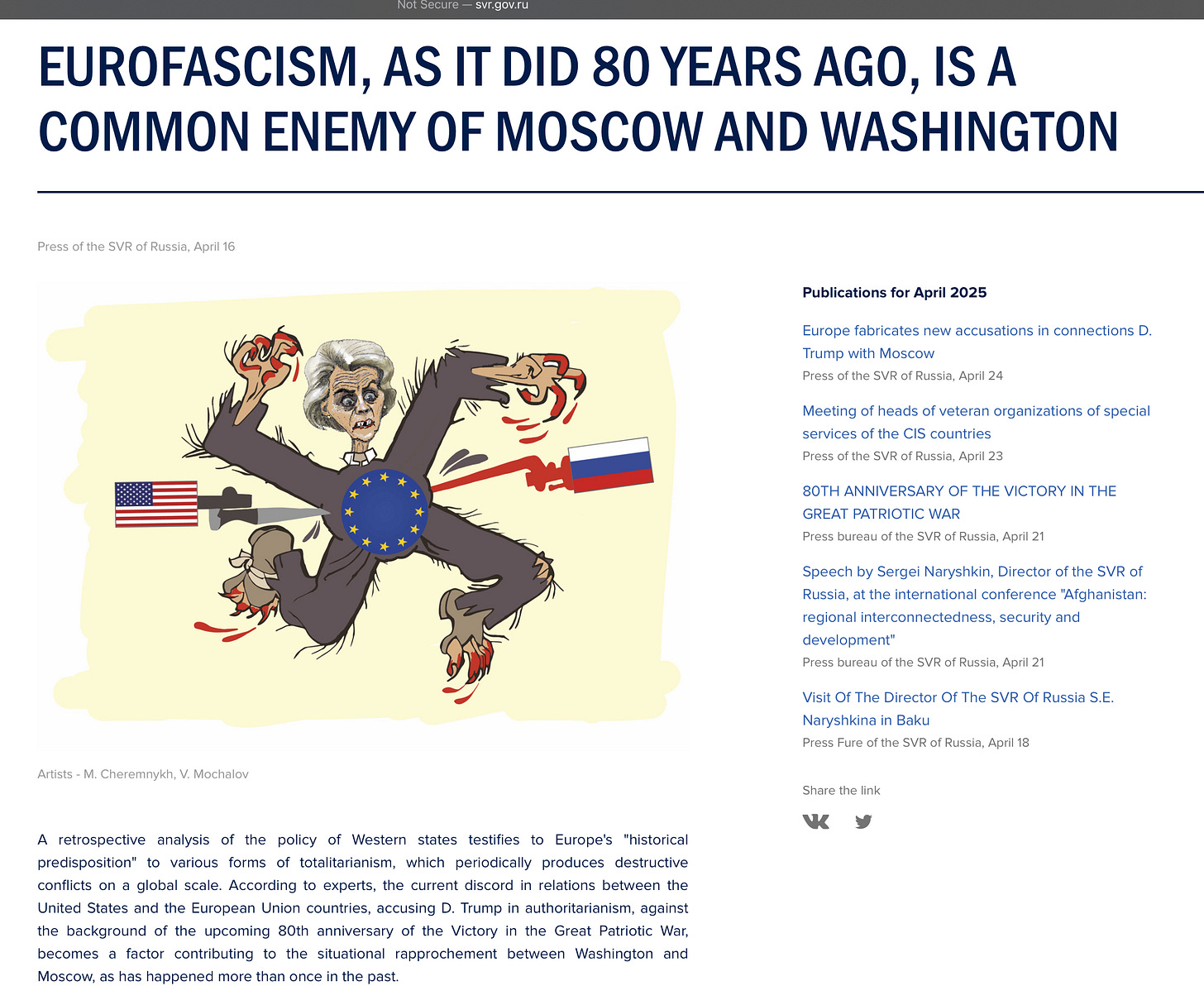 The Russians are openly saying that the Trump regime and the Russian Federation have a “common enemy” which they are calling “Eurofascism.” The cartoon they created to illustrate this concept is of the President of the European Union, Ursula von der Leyen as a Swastika monster being stabbed with Russian and American bayonets.