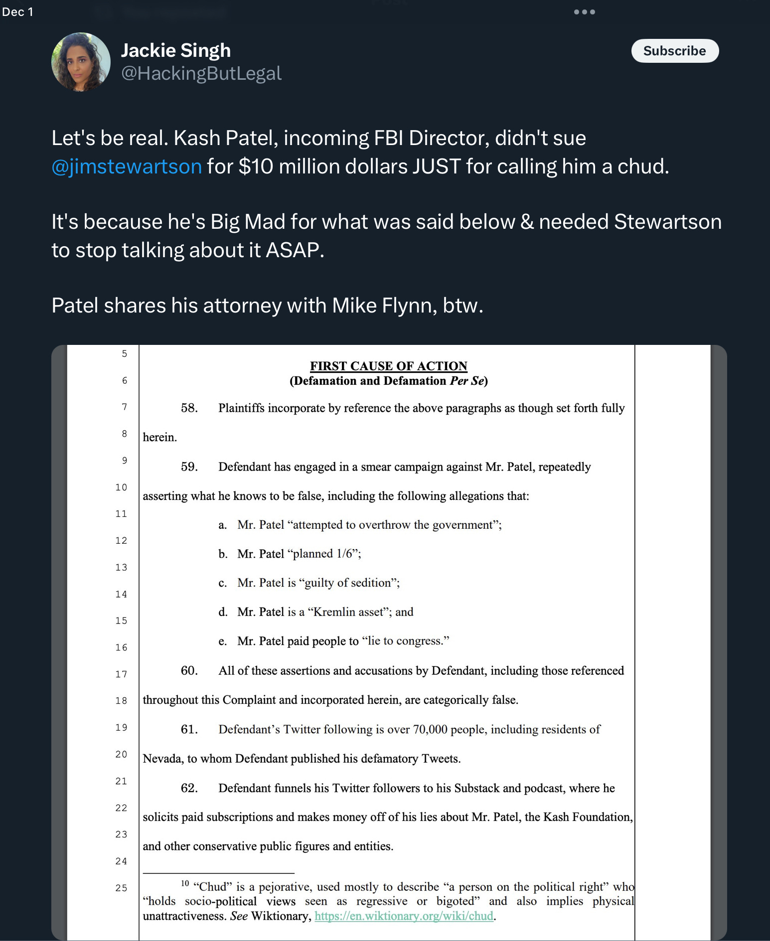Of course, Patel also tried to sue me in Nevada for $10 million for defamation, a case which I was never served for but sits there nevertheless.