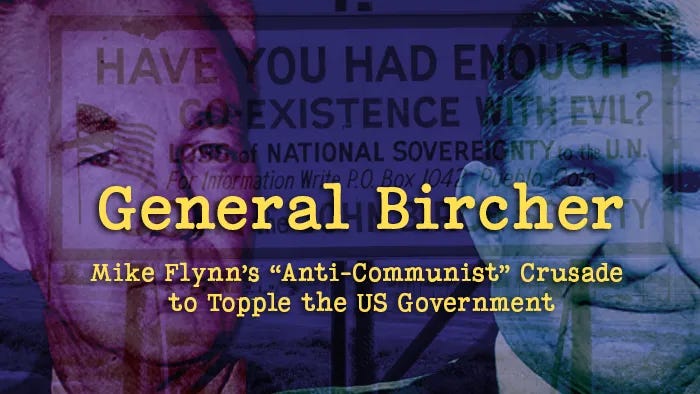 Flynn says the Department of Justice, the education system and much of the rest of society has been “consumed by communism,” a claim which has no basis whatsoever, and obviously recalls McCarthy and John Birch Society, which Mike Flynn was born into and Trump’s father funded.