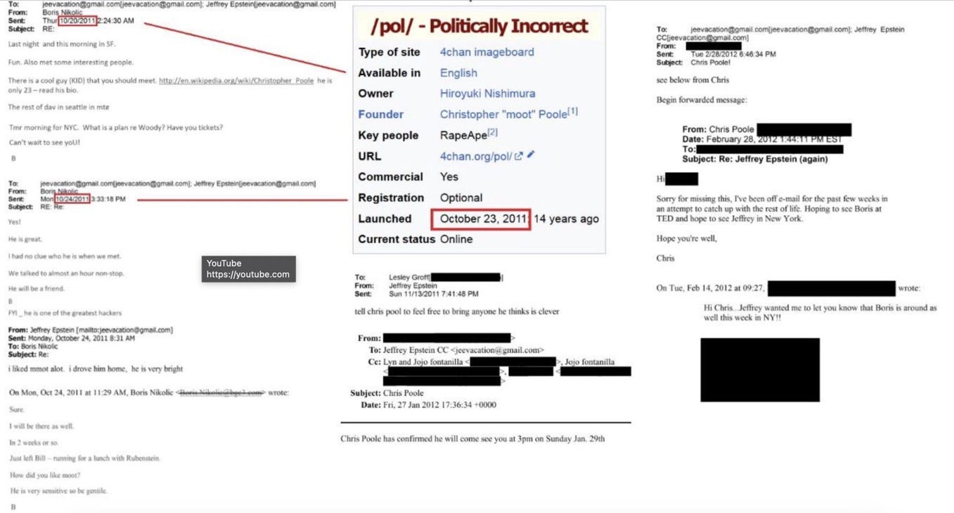 The story of Epstein’s desire to create the conditions for America’s demise goes back many years. For example, one of the most vile and dangerous places on the internet, the /pol board on 4chan, was created the day after the owner, Chris Poole, met with Epstein.