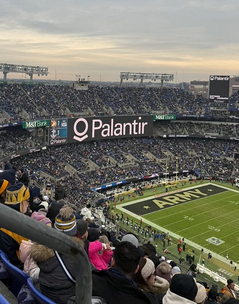 Nevertheless, there is a major effort by Palantir to normalize its behavior and capture public brand recognition by doing things like sponsoring the Army-Navy game on Saturday—which Trump attended. This is part of an effort to justify its absurd market valuation—but it’s also psychological. They want you—and Trump—to get used to their presence.