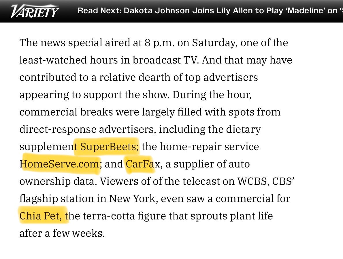 The only good news from this is that the “new CBS” doesn’t seem to be going very well so far. Advertisers are “wary”—except for the makers of the Chia Pet.