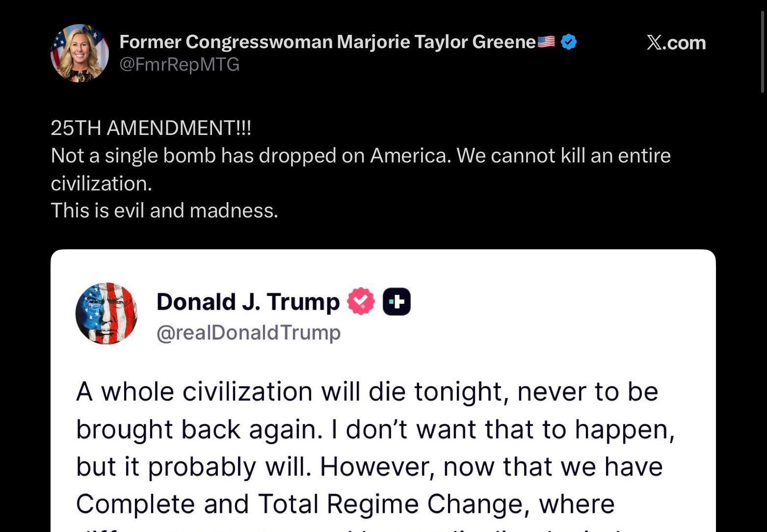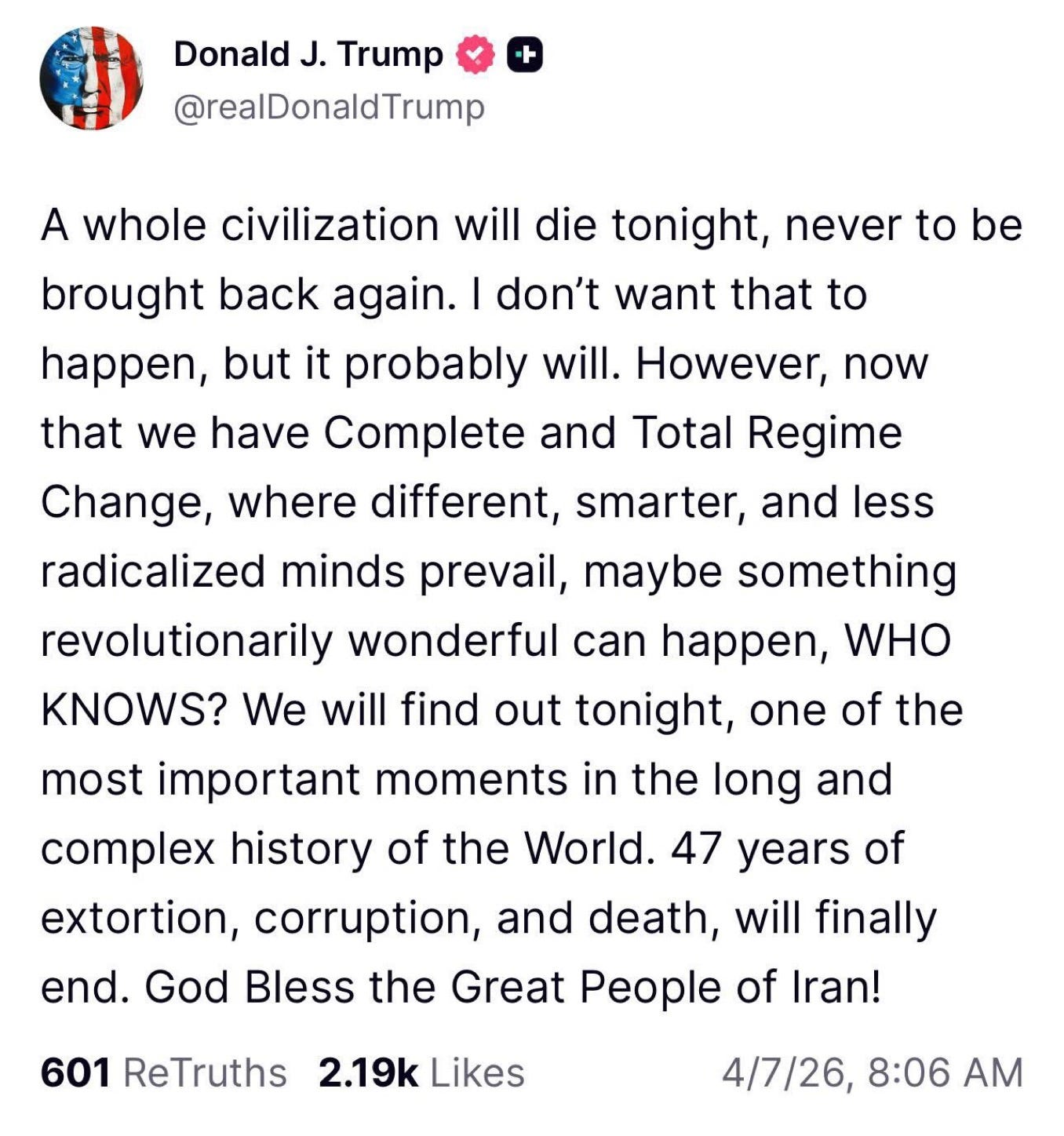 Tuesday morning, Donald Trump promised that the oldest civilization on Earth, Persia aka Iran, “will die tonight”—an overt, unmistakable threat of genocide.