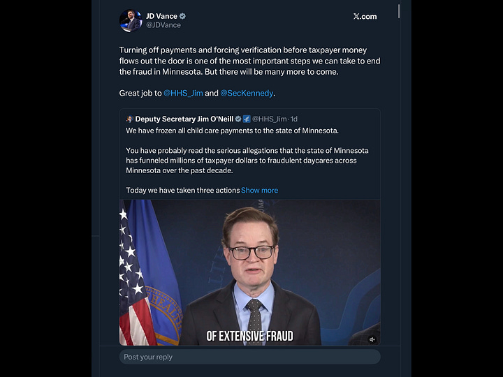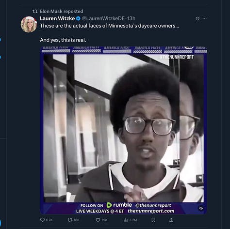 While there has been actual fraud in childcare facilities in Minnesota, it was thoroughly investigated and prosecuted by Merrick Garland’s DOJ. Nothing new was discovered by Nick Shirley. Also, note that one of the main beneficiaries of the original fraud was decidedly non-Somalian Aimee Bock of Feeding Our Future.