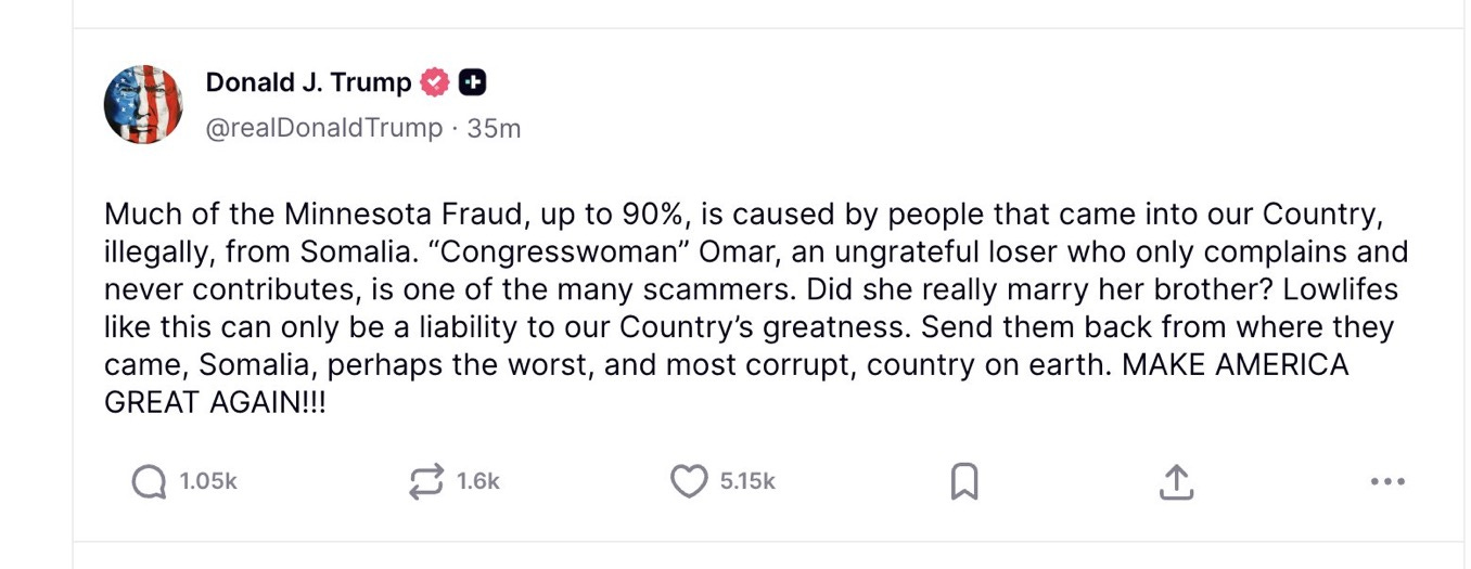 While the federal government goes masks-off for ethnic cleansing, apartheid-born oligarch Elon Musk transformed the “town square” on his platform into a 24/7 campaign to dehumanize Somalis.