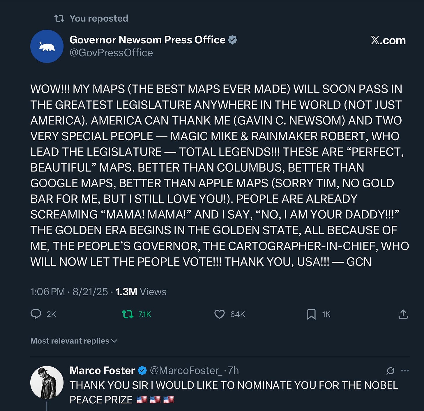 This is one of your best articles because it’s simple enough for me to really understand it. Fantastic insights. I’m a huge fan, and you just keep getting better. I’m very happy about Newsom’s attacks. They’re a model for the resistance, bringing us hope and joy while fighting back effectively. Kudos to your governor and his team.