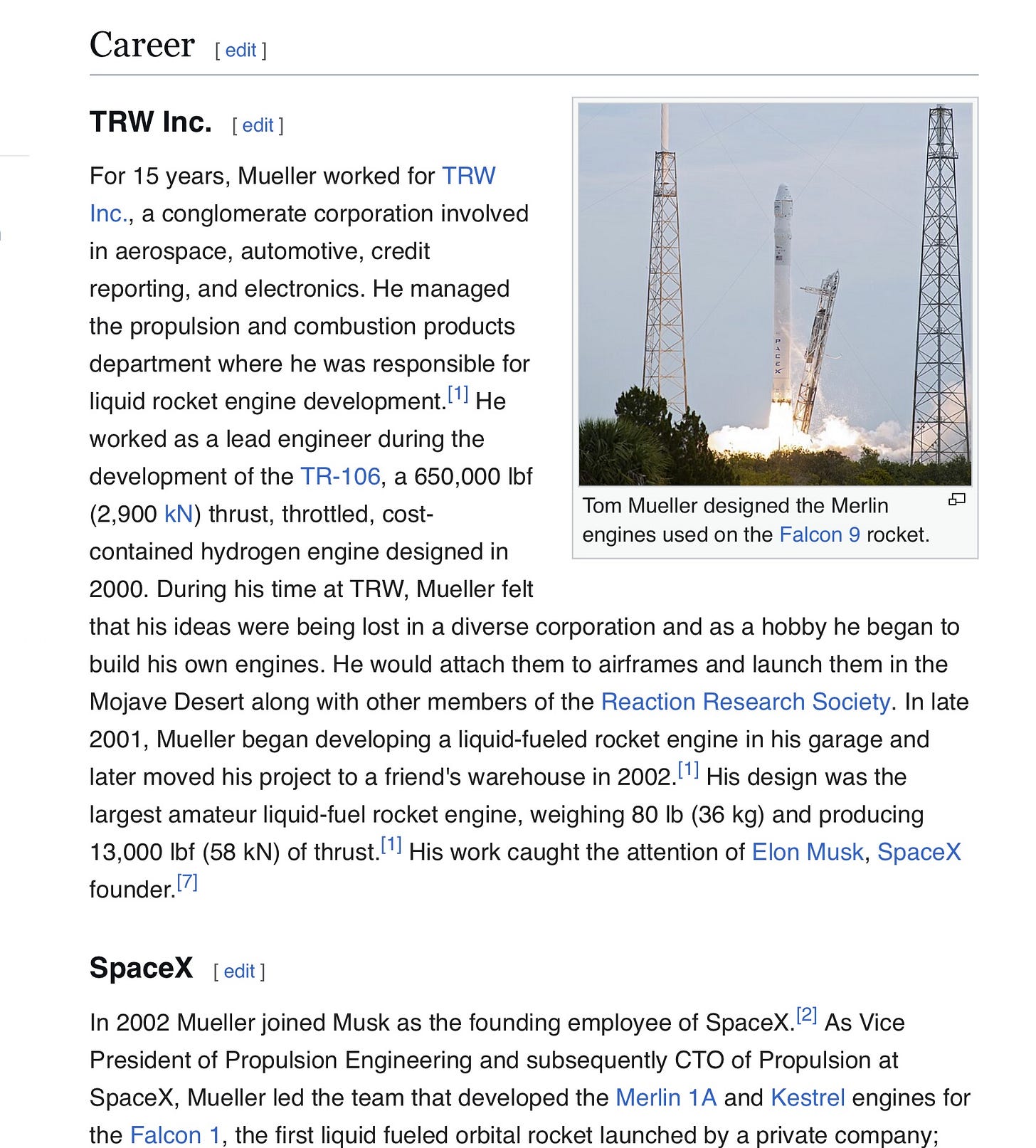 In 2001, Elon Musk became interested in the work of the top engineer at TRW, Tom Mueller — who was building on the work of Adolf Thiel — and poached Mueller to become the founding employee of SpaceX.