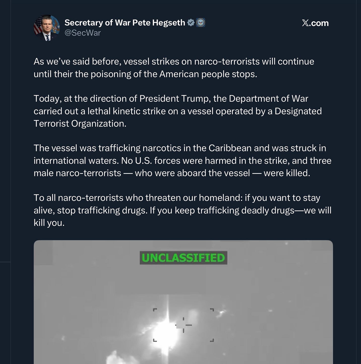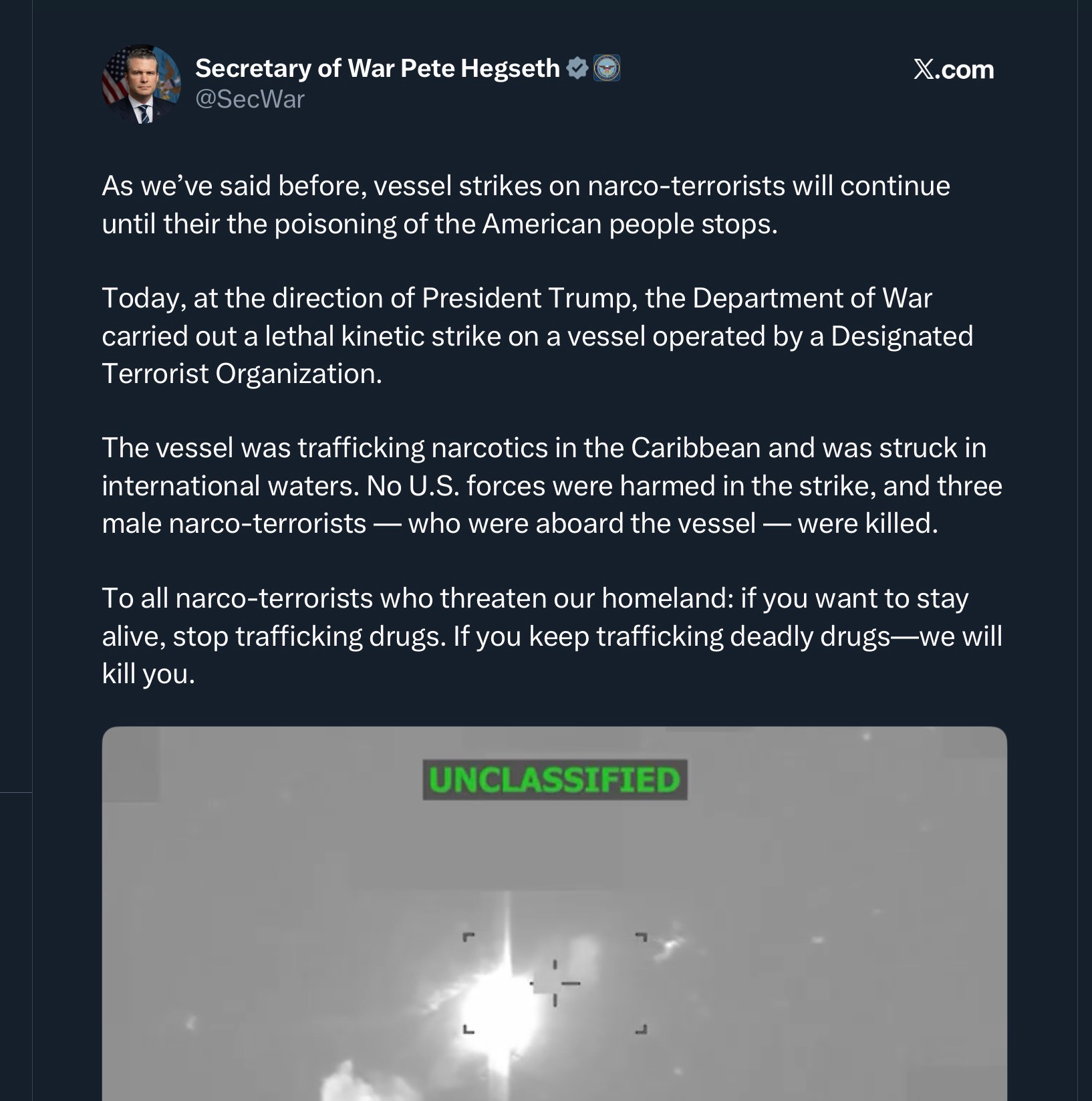 The regime’s aggression in Venezuela is a mirror of the plan to use a moral panic in Nigeria as an excuse to invade a nation with rich natural resources. Friday morning, the “War Secretary” tweeted about the seventeenth “drug boat” attacked in the Caribbean and eastern Pacific.
