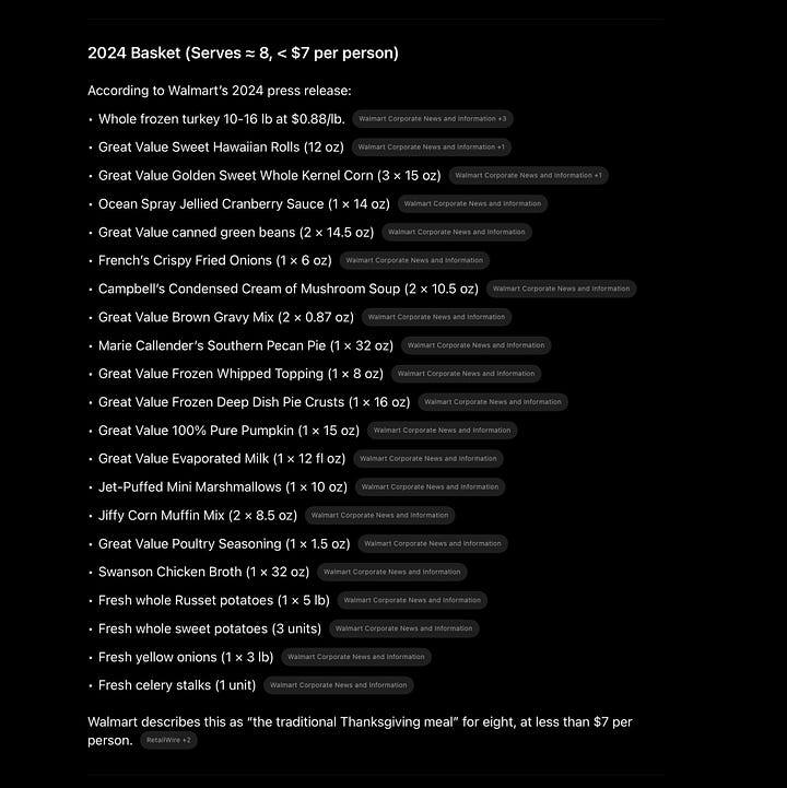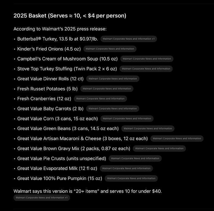 Trump’s lies are too voluminous to list but his whopper about Walmart is perhaps the most absurd. Citing an annual store promotion, he ludicrously extrapolates that Thanksgiving is suddenly 25% cheaper because Walmart offered a cheaper deal this year with fewer items.