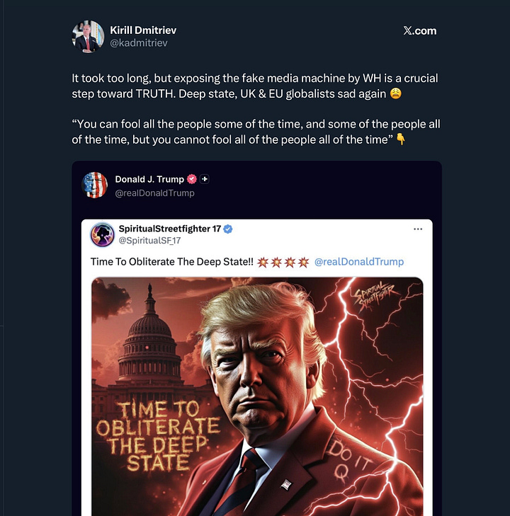 While Peter Thiel takes control of our national scientific assets, Elon Musk admits to using his platform to “purge” the “woke mind virus”—which he identifies as any conversation about bigotry. Putin’s lead negotiator for Russia is boosting the White House’s attack on the “fake news”—with QAnon memes—while America’s lead negotiator Steve Witkoff is a stone cold traitor.