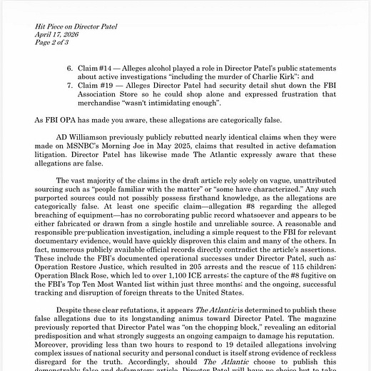 This morning, Kash Patel confirms that he will be suing the reporter—“coming tomorrow.”