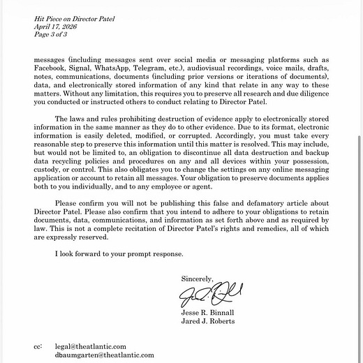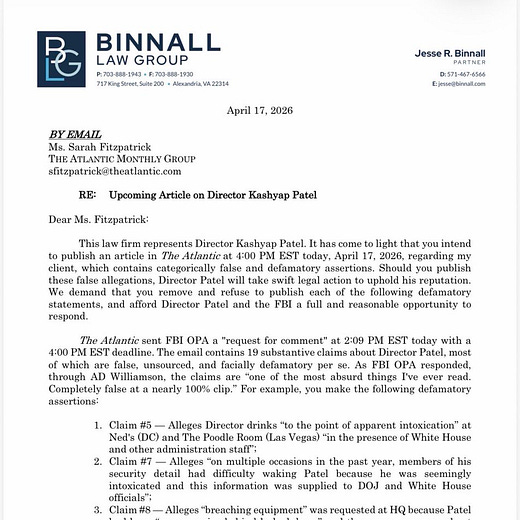 In response to the story in the Atlantic, Jesse Binnall, one of the most corrupt lawyers to ever hold a license—and the attorney in both Mike Flynn and Kash Patel’s frivolous lawsuits against me—tweeted a letter threatening to sue the journalist for defamation.