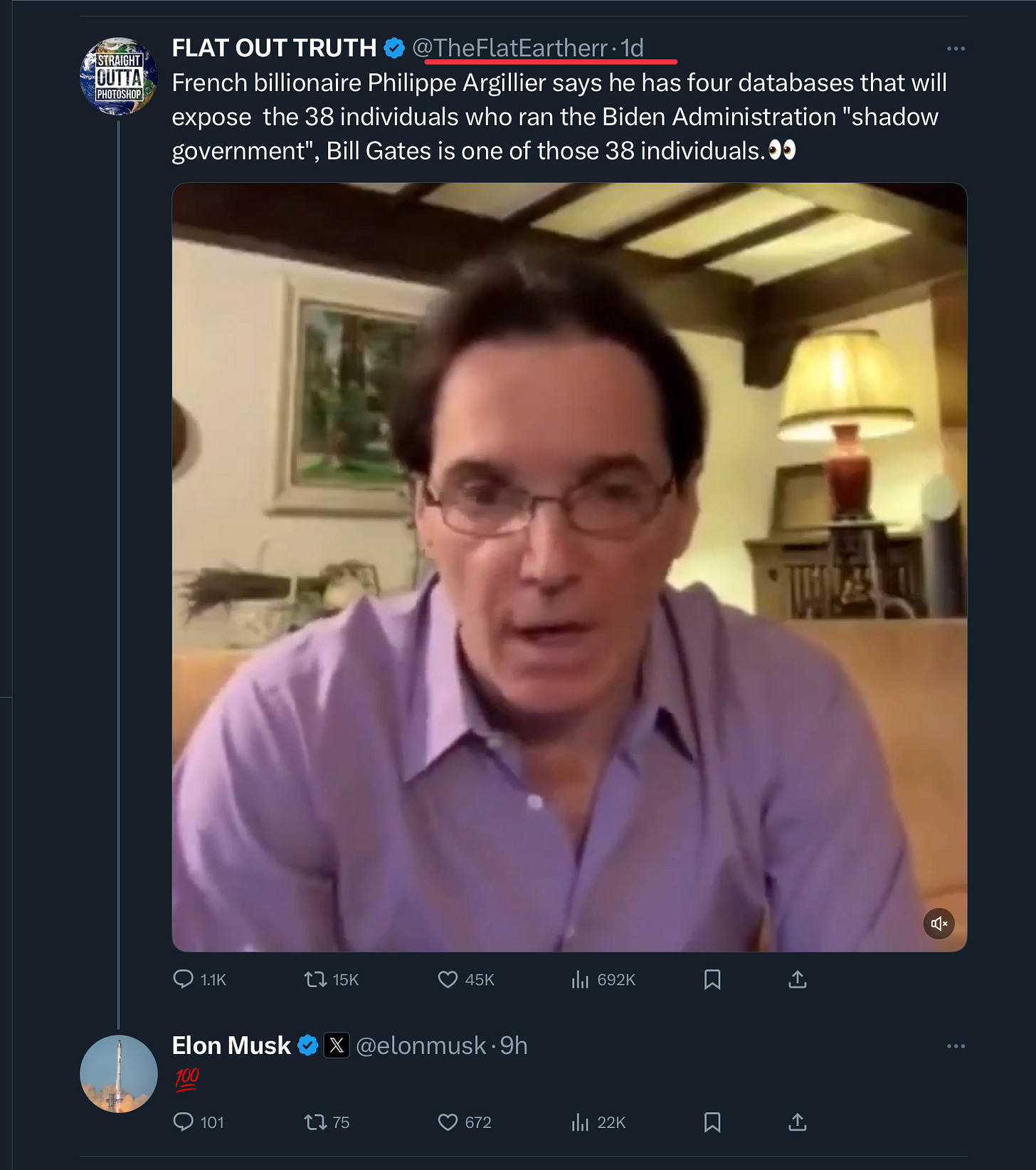 As one more example, here is the richest man and the CEO of SpaceX promoting a devoted flat-earth account in order to smear the former richest man Bill Gates—who was recently invited to the White House AI summit, while Elon Musk was not.
