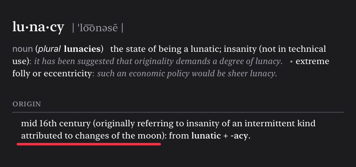 The word lunacy comes from a centuries-old superstition that people suddenly become crazier based on the appearance of a full moon. This idea was added to the ancient myth of werewolves by Hollywood. Myth added to myth can make a good story—for a movie.
