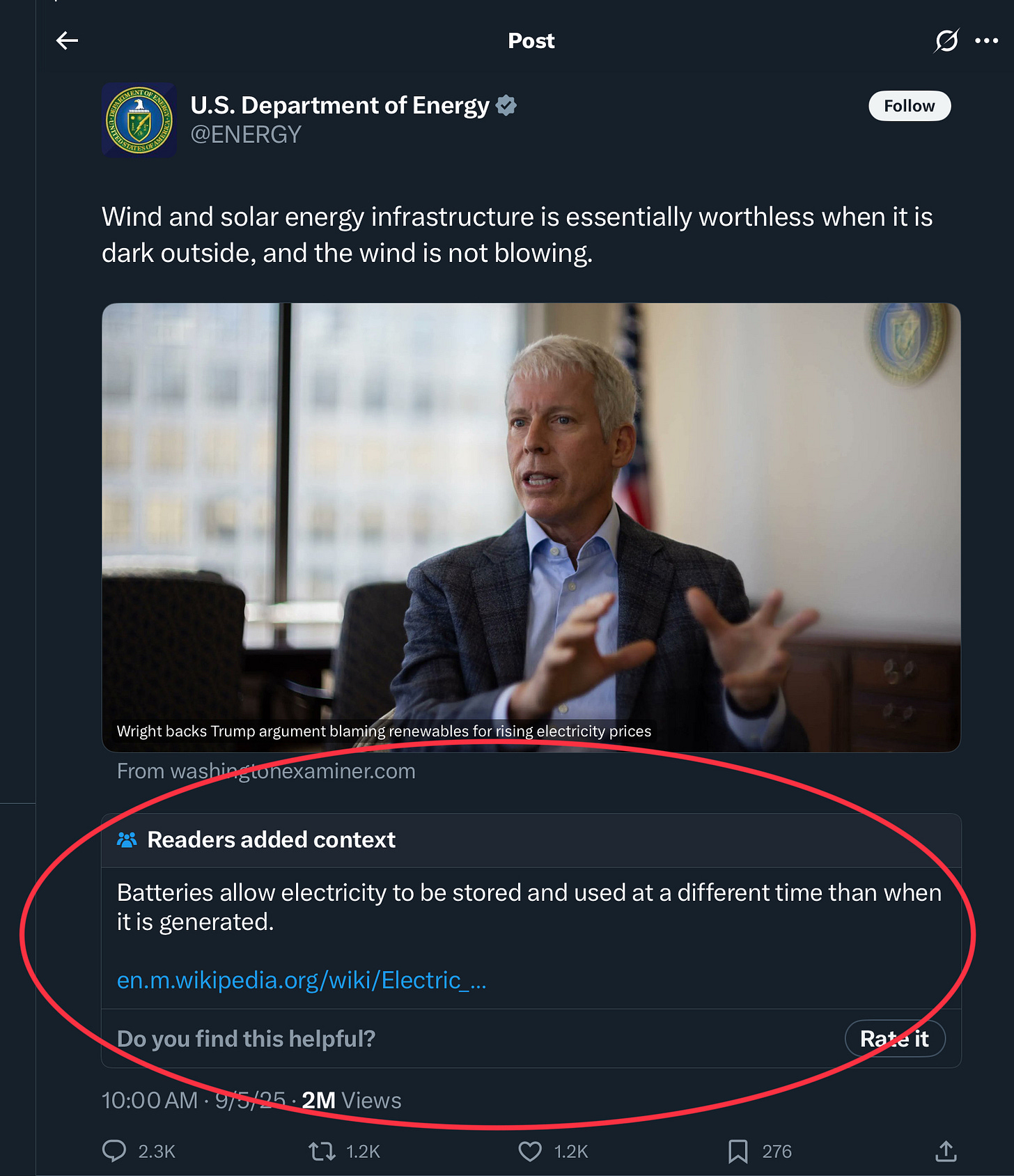 This is not just a bit of disinformation from a member of Trump’s Cabinet, it is a complete denial of modern reality. Volta invented the battery in 1800. Gaston Planté invented the first rechargeable battery in 1859. Whoever tweeted the quote from Secretary of Energy was doing it on a device with a rechargeable battery.