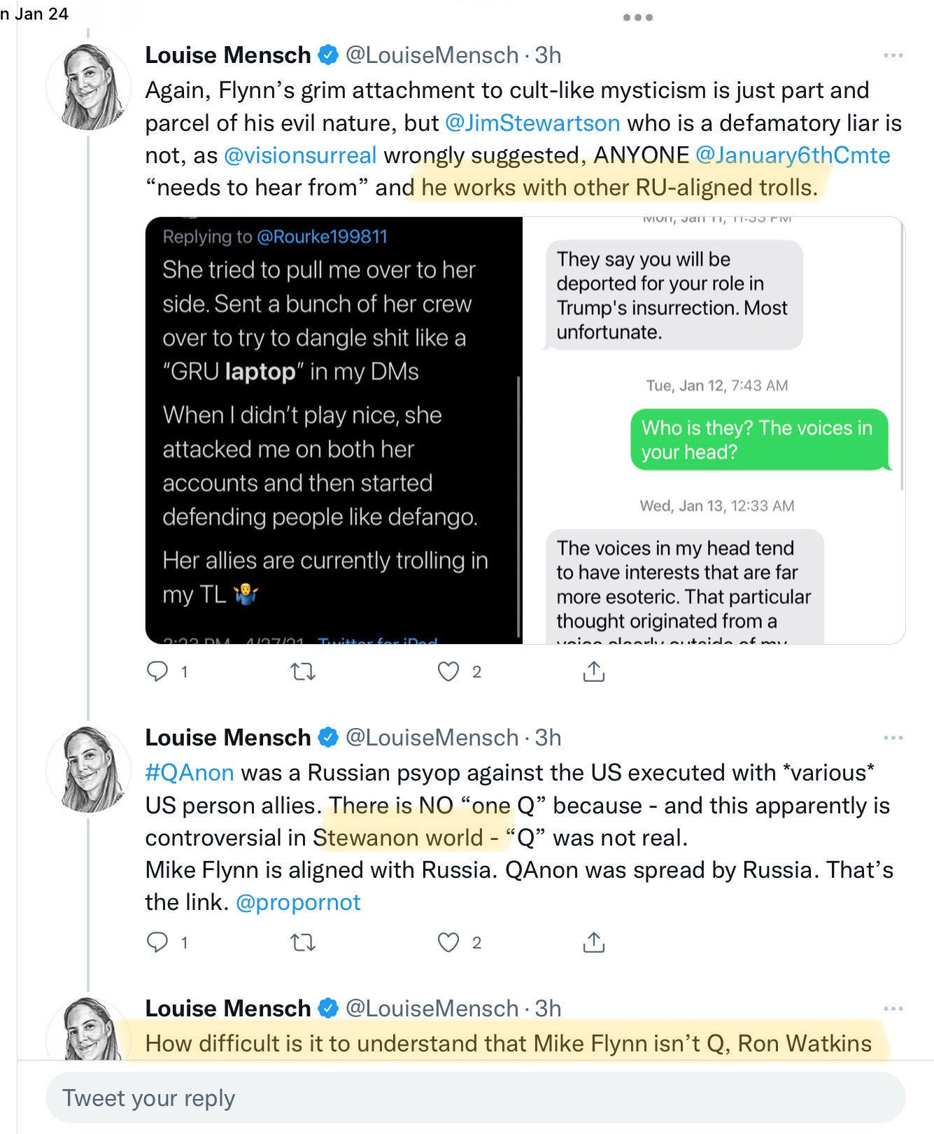 Louise Mensch says I’m working with “RU-aligned trolls” and says “Mike Flynn isn’t Q”